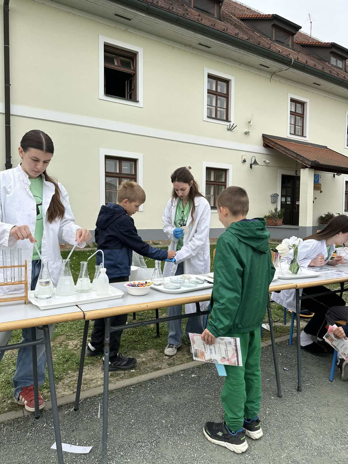 Marta Ratković, učenica 3. razreda Klasične gimnazije, opisala nam je aktivnost svoje grupe: Moje prijateljice i ja vodimo radionicu kemijskih pokusa koje djeci predstavimo na zanimljiv interaktivan način. Za prvi pokus imamo sok crvenoga kupusa te različite otopine. Kada se u te otopine doda crveni kupus, mijenja se boja. Za drugi pokus na filter papir crnim flomasterom djeca nacrtaju neki oblik i u alkoholu taj crni flomaster mijenja boju, i tako vidimo od čega je crna boja. U trećem pokusu na štapić stavimo dezodorans. Kada ga djeca stave u vodu, nastanu mjehurići. Za sljedeći pokus pošpricamo otopine na umjetne cvjetove bijele boje i oni promjene boju u ružičastu. Za kraj imamo i 3D olovke kojima crtaju različite oblike. Djeca ih mogu ponijeti kući.